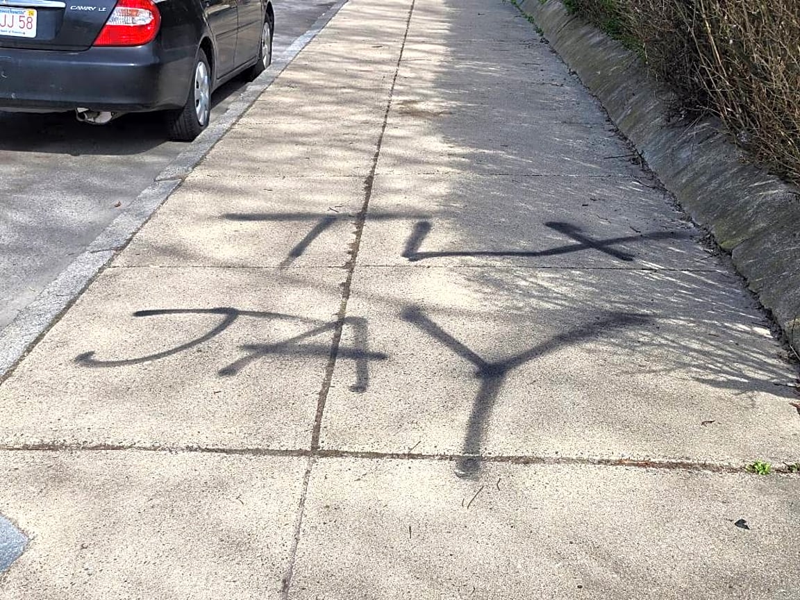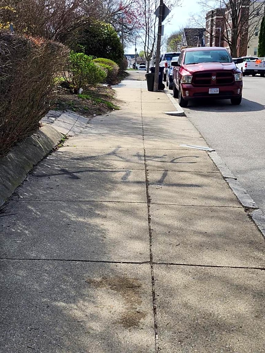 6 Bowdoin Ave, Dorchester, Ma, 02121Constituent describes large spraypainted letters on sidewalk | Graffiti location: [Sidewalk] Graffiti surface: [Concrete]