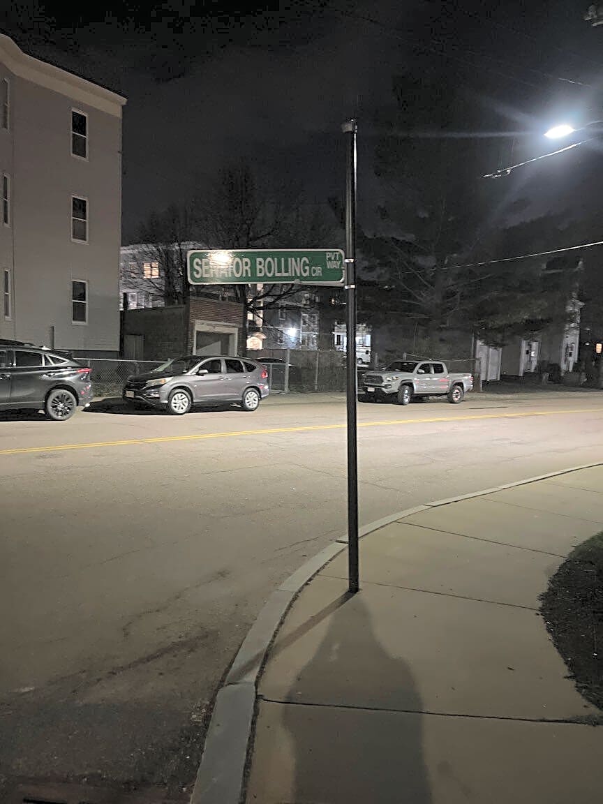 Intersection Of Brookview St And Senator Bolling Cir And Harvard St, Dorchester, MaSign need to be removed as it is no longer a private way. Also, the sign is too low because of the wind