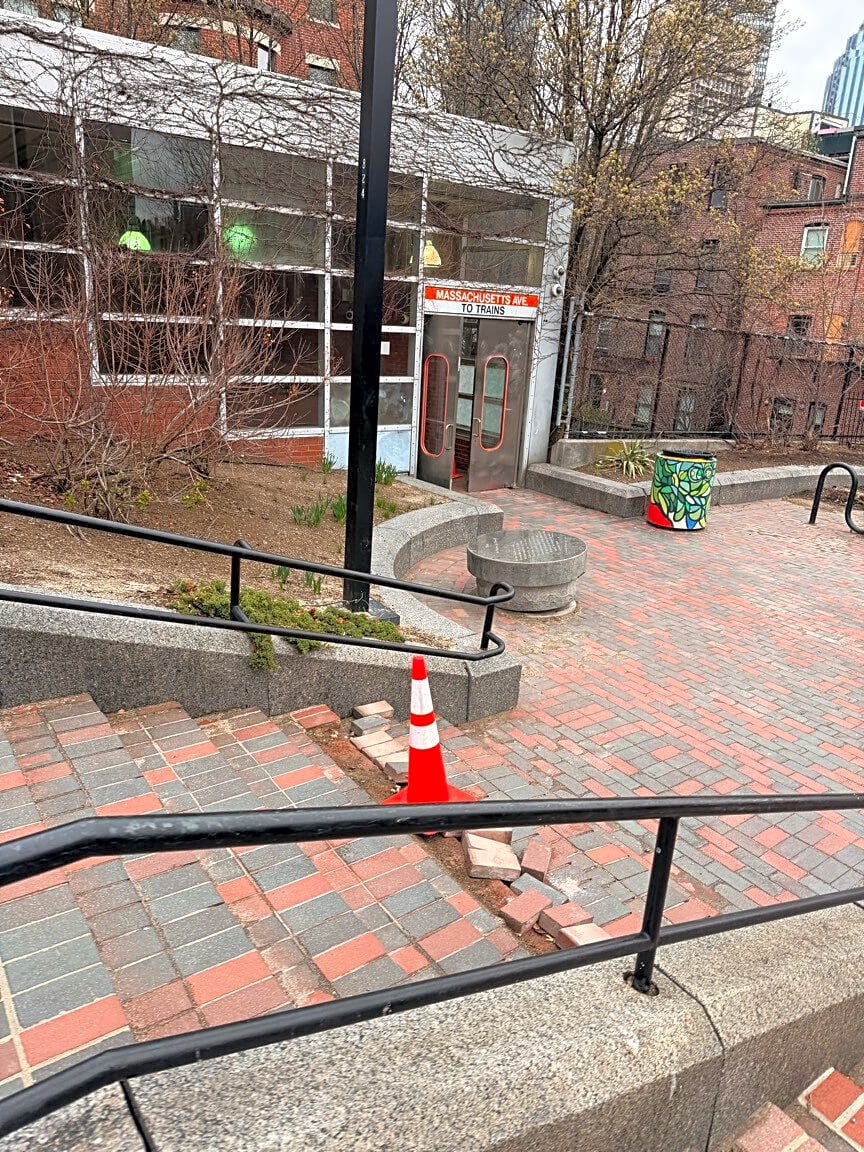 380 Massachusetts Ave, Boston, Ma, 02115Hello! These are the steps at the Mass Ave T stop…the steps are really in bad condition and need to be fixed before someone trips. Thank you in advance!